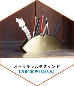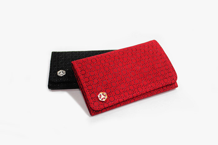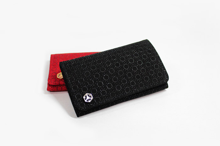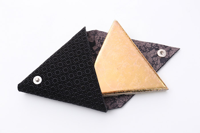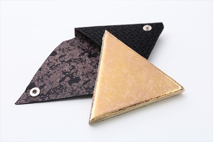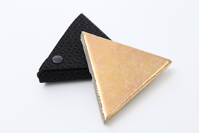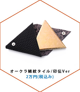 - 旧本館1階の宴会場玄関のひさし部分に使われていた、金色の鱗紋タイルを、限定の記念商品にしました。印伝製の特注ケースに入れてお届けします。
