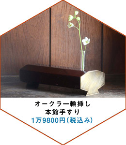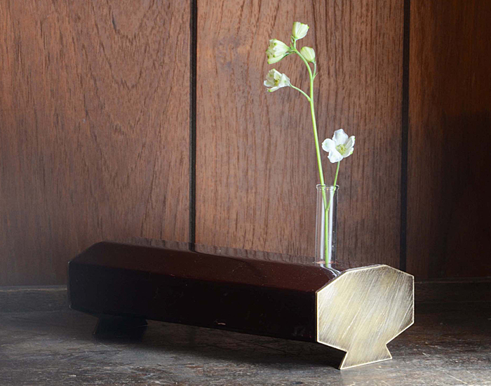 - 旧本館で使われていた漆ぬりの手すりを一輪差しに加工しました。切断面は真鍮のバイブレーションで塞いでいます。多くのゲストを支えてきた手すりをよみがえらせました。