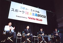 | <ホスト> 青島健太(スポーツライター・左) '58年、新潟県生まれ。慶応大から東芝へ進み強打の大型三塁手として注目を集めた。'85年にヤクルトスワローズに入団。'89年退団後、スポーツライターに転身。現在は、スポーツライター、キャスターとして、テレビ、ラジオ、雑誌等で活躍している。 <ゲスト> 二宮清純(スポーツライター・右) '60年、愛媛県生まれ。スポーツライターの第一人者として、新聞、雑誌、テレビ等を舞台に幅広く活躍中。主な著書に、「Do or Die」(KSS出版)、「スポーツ名勝負物語」(講談社現代新書)がある。 向井昭吾(ラグビー日本代表監督・左からふたり目) '61年、愛媛県生まれ。東海大から、ラグビーの名門・東芝府中へと進み、日本代表フルバックとして躍動。日本代表13試合出場。'94年、東芝府中の監督に就任。'97年から日本選手権3連覇を達成。その手腕を評価され、'00年12月、日本代表監督に就任した。 栗原徹(ラグビー日本代表スコッド・右からふたり目) '78年、茨城県生まれ。177cm、80kg。WTB/FB '97年、清真学園高より慶応大へ進み、「対抗戦」「大学選手権」2冠達成。日本代表初キャップは、'00年5月のフィジー戦。現在所属するサントリーでも、1年目から試合に出場、春のジャパンセブンズ、ウェールズ戦撃破、東日本社会人、社会人大会、日本選手権の5冠達成に貢献した。 |
