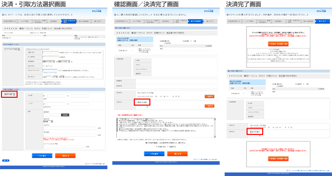 決済・引取方法選択画面/確認画面/決済完了画面、購入確認メール内にて「配送でお届け」との記載がありますが、チケットは「宅配便」にてでのお届けとなります。