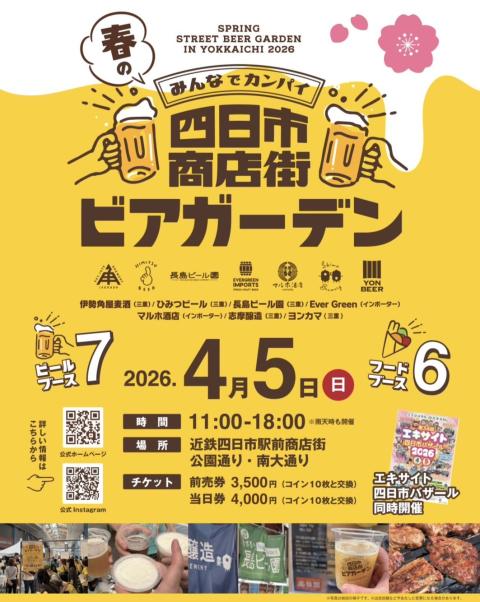 商店街内アーケード(公園通り、南大通り)にて春の四日市商店街ビアガーデンを開催!