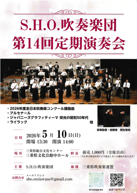S.H.O.吹奏楽団は『吹いて』『奏でて』『楽しむ』をモットーに活動する吹奏楽団です。