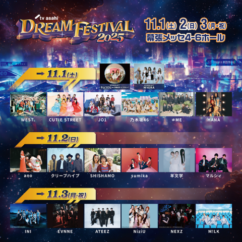 11/1(土)~3(月・祝)の3日間にわたり幕張メッセ 国際展示場 4~6ホールにて開催! 11/1(土)はWEST.、JO1、乃木坂46ら、11/2(日)はクリープハイプ、SHISHAMO、sumikaら、11/3(月・祝)はINI、ATEEZ、NiziUらが出演!