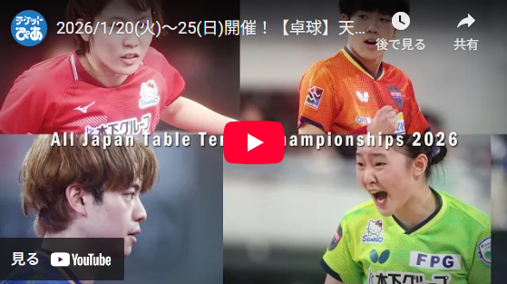 男女シングルスの全日本卓球選手権大会が1/20(火)~1/25(日)、東京体育館にて開催。全国から勝ち上がった全日本チャンピオンが決定!前回優勝した松島輝空と早田ひなのほか、篠塚大登、張本智和、張本美和、大藤沙月らが出場予定!