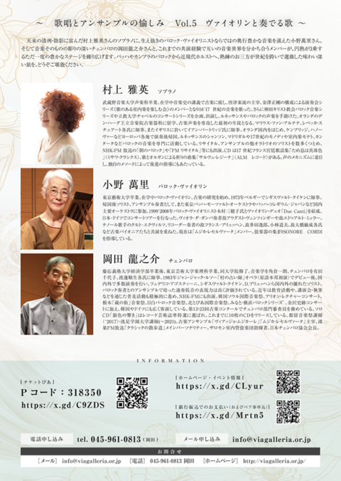 天来の清冽・陰影に富んだ村上雅英のソプラノに、生え抜きバロック・ヴァイオリニストならではの奥行豊かな音楽を湛えた小野萬里、そして音楽そのものの彫りの深いチェンバロの岡田龍之介と、互いの音楽世界を分かち合うメンバーが、円熟極まるただ一度のステージを繰り広げます。バッハ。カンプラのバロックから近現代ホルストへ、熟練の3名が世紀を跨いで選曲した味わいの旅を堪能。