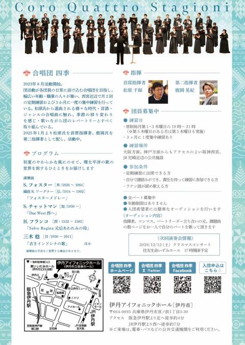 東京混声合唱団正指揮者松原千振を首席指揮者、そして現在関西を中心に合唱指揮者・ソリストとして活躍中の鹿岡晃紀が第二指揮者を務める「合唱団 四季」。今回の演奏会は、環太平洋の曲がテーマです!東南アジア、オーストラリア、中南米、カナダ、そしてもちろん日本の曲も!演奏会場で世界旅行をお楽しみください♪