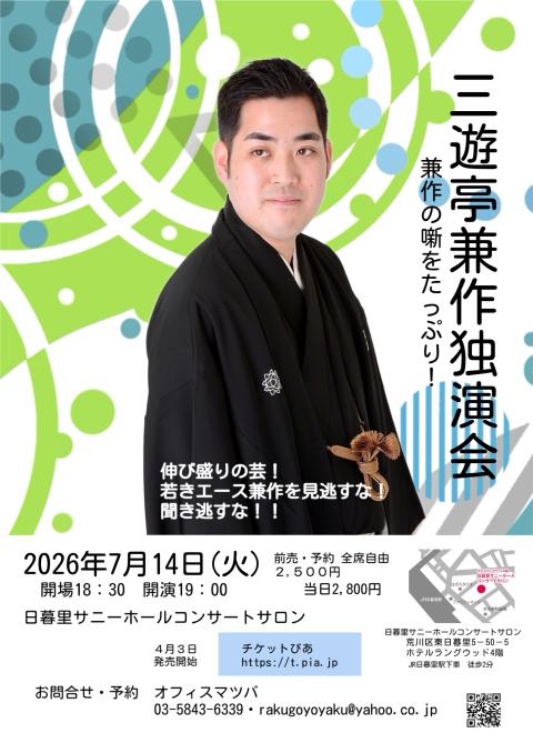 昨年二ッ目に昇進した三遊亭兼作の独演会です