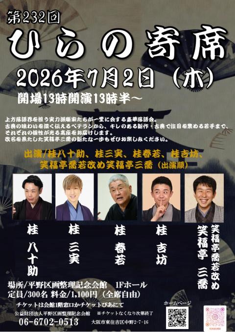 上方落語界を担う実力派噺家たちが一堂に会する豪華落語会ひらの寄席