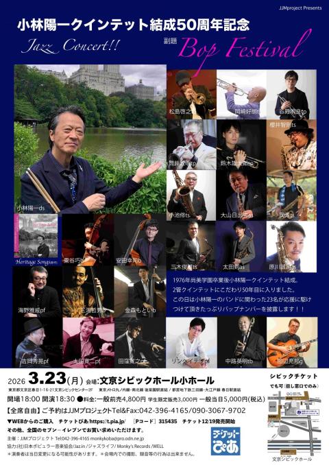 小林陽一のクインテット結成50周年を祝ってこのバンドに携わったメンバー23名がバップナンバーで共演。