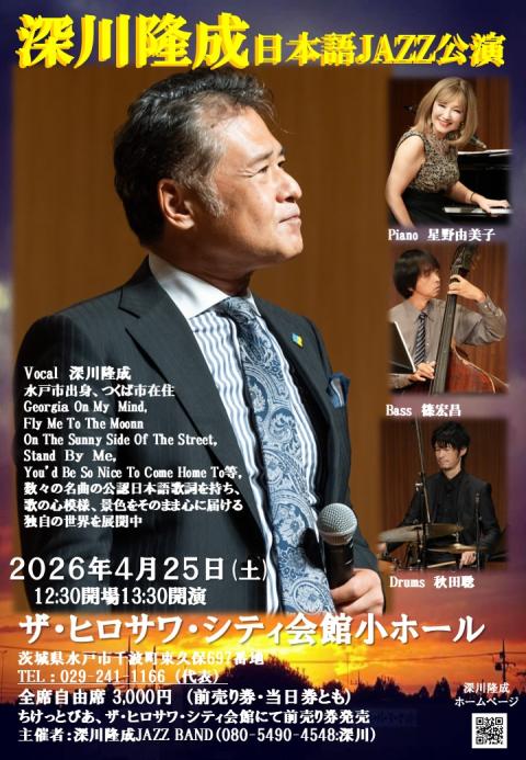 日本語でJAZZを歌う歌手深川隆成が生まれ故郷水戸で歌詞の心と風景を届ける。