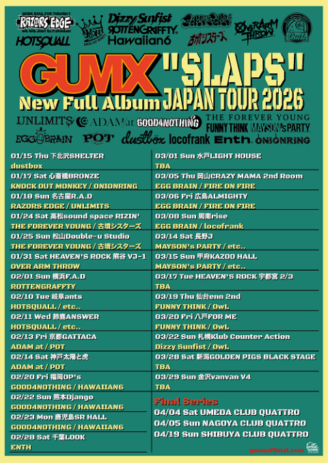 GUMX史上最大規模となる計30ヵ所を巡る「GUMX New Full Album “SLAPS” JAPAN TOUR 2026」開催!