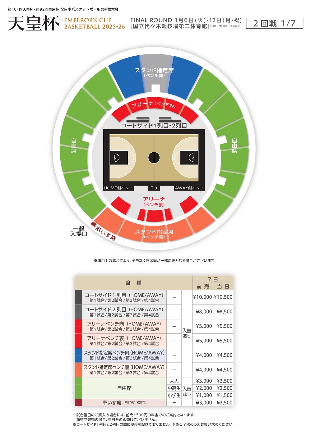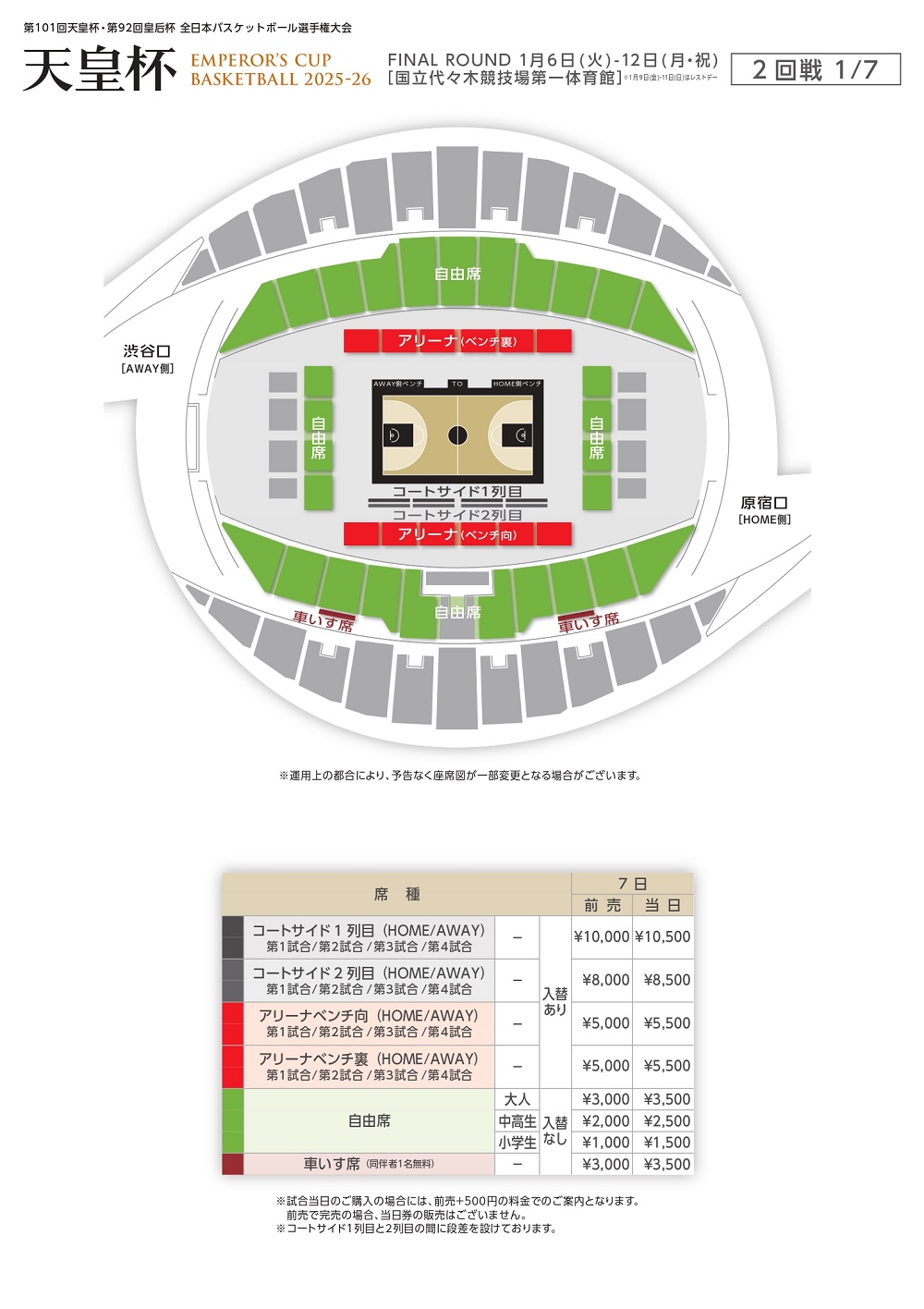 ・1/6(火)、7(水)当日の天皇杯のチケットをお持ちの方は、同一日の国立代々木競技場で開催されている天皇杯の自由席のチケットを割引で購入いただけます。