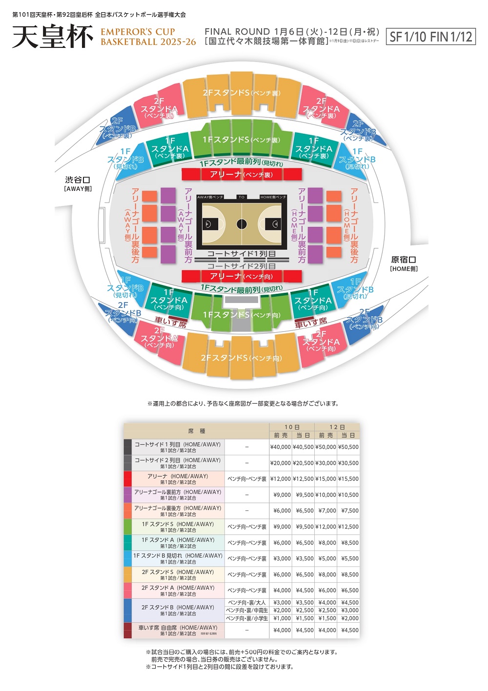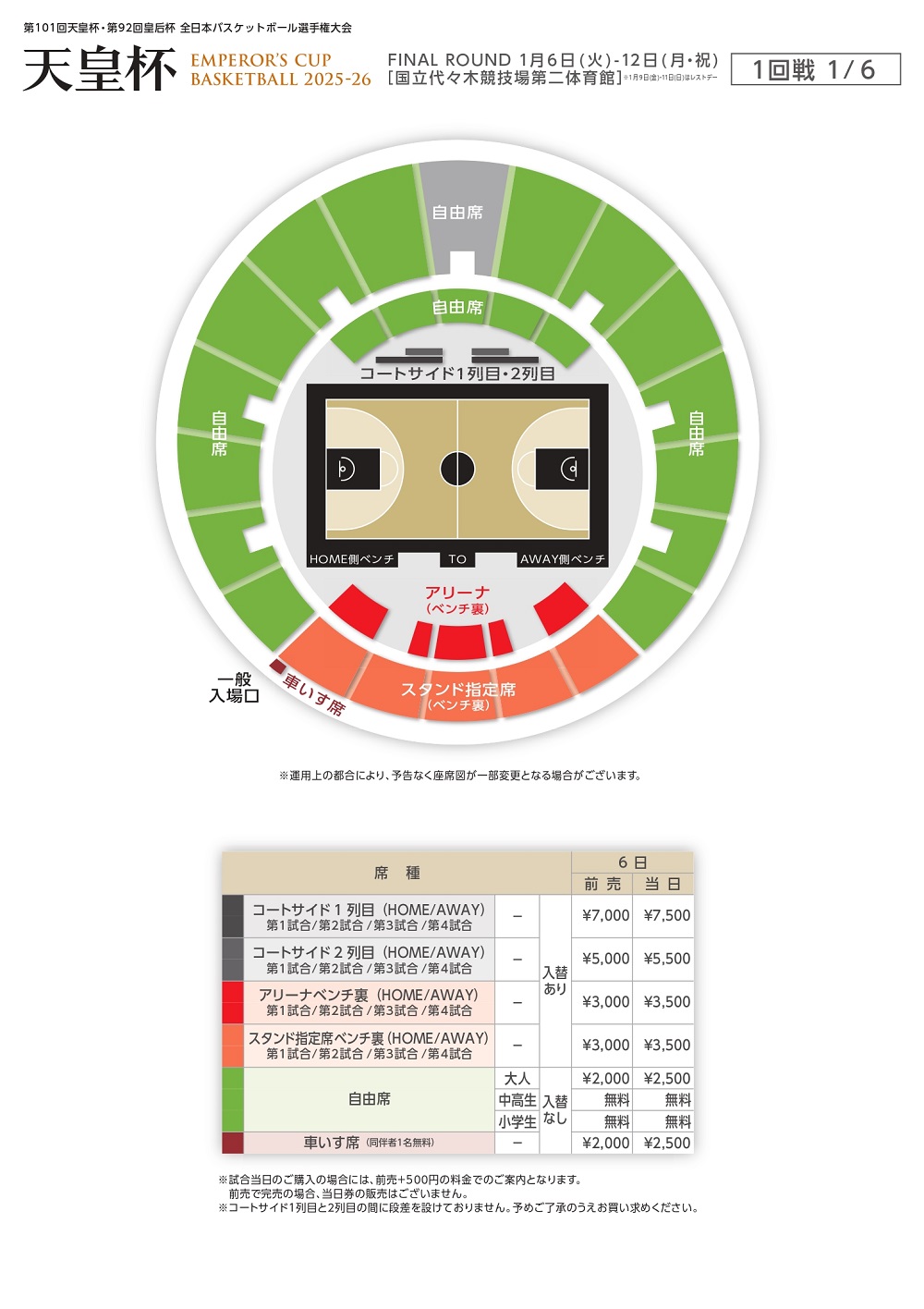 ・会場の構造上、手すりなどでコートが見えずらい席がございます。予めご了承ください。