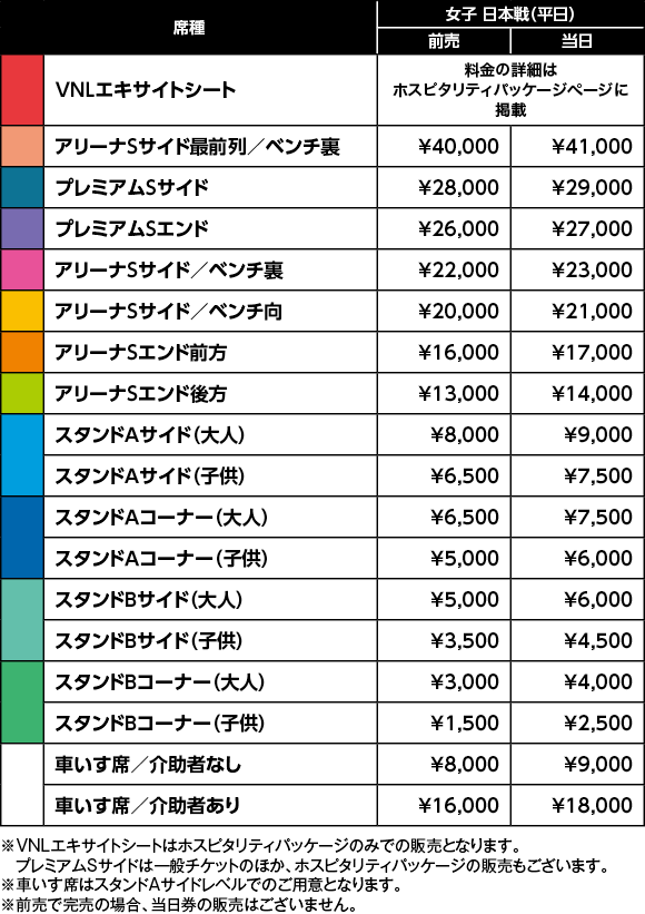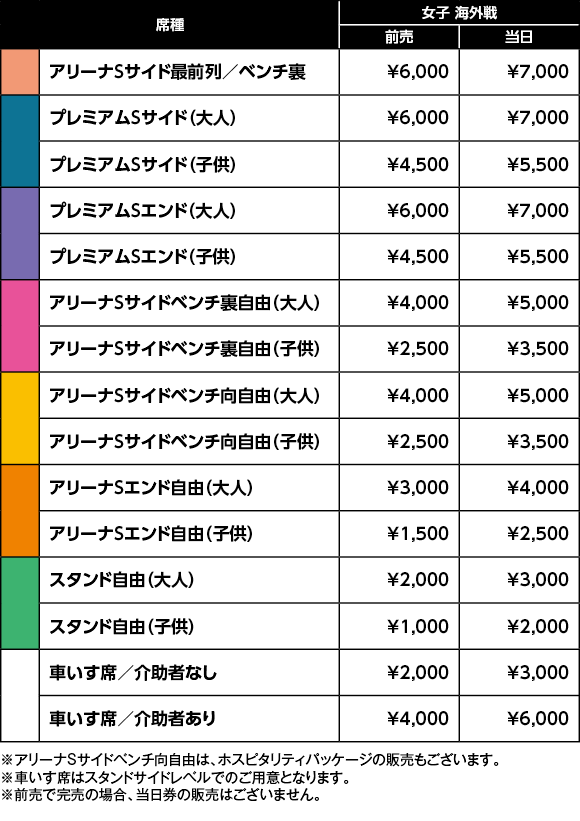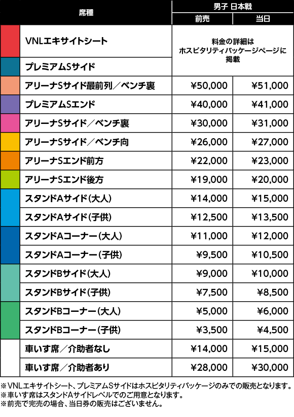 ・車いす席介助者の方は、車いすご利用のお客様と同時入場が必要です。介助者の方が2名以上の場合は、チケット購入前にhttps://www.jva.or.jp/faq/から問合せください。車いす席は一般発売からの販売となります。