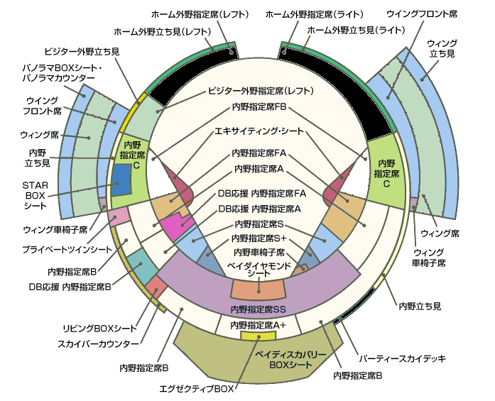 *ホーム応援席(DB応援 内野指定席FA/A/B、ホーム外野指定席、ホーム外野立ち見(ライト/レフト))でのビジターチームへのご声援はご遠慮ください。