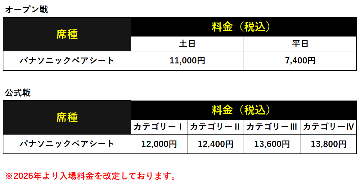 ※パナソニックペアシートは2名様分の料金となります。定員未満でご来場の場合でも、未使用の入場券の払い戻しは一切できません。