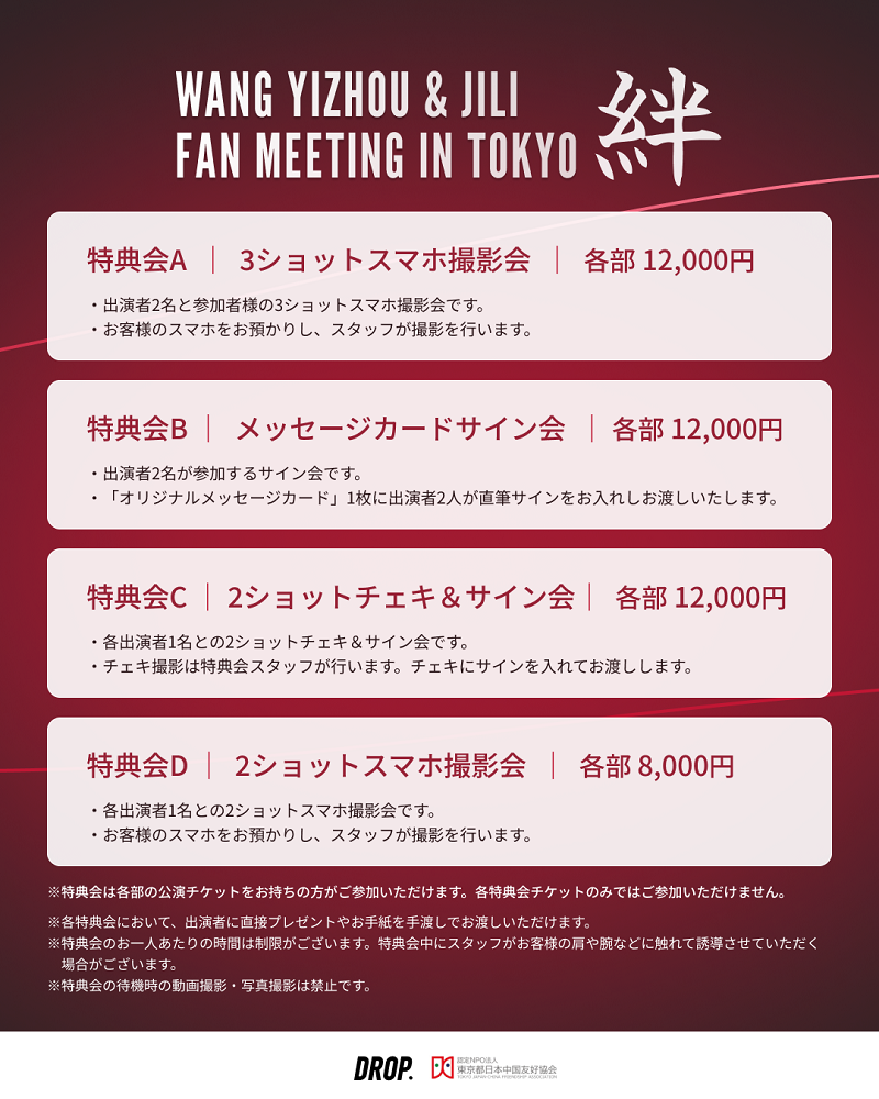 6歳以上チケット必要、6歳未満入場不可。イベントには撮影のカメラや取材が入る可能性がございます。撮影した映像や画像は、インターネットを含む各種媒体、映像作品等で使用する可能性がございます。車椅子でのご来場の際には発券開始前までに主催者へご連絡<info@drp.asia>をお願いいたします。特典会は各公演の終了後に行います。特典会の参加は同一公演の「公演チケット」が必要です。特典会に関しては公式ホームページをご確認ください。