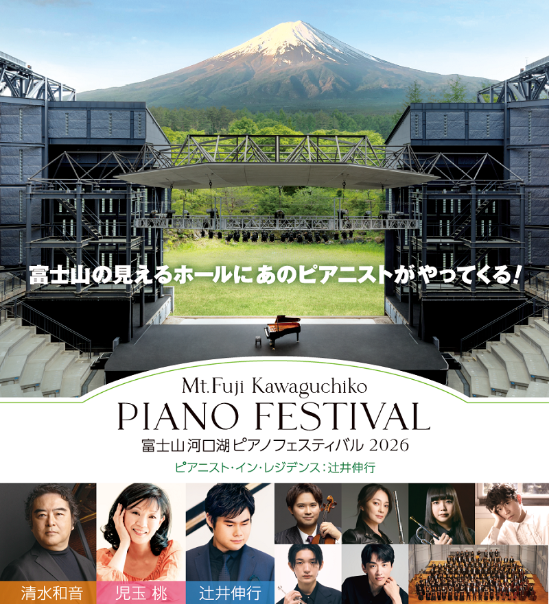 富士山の麓と河口湖という大自然の中で繰り広げられる音楽祭。2026年は辻井伸行(ピアニスト・イン・レジデンス)、清水和音、児玉桃、壷阪健登、三浦文彰、高木綾子、児玉隼人、松井秀太郎らが出演!