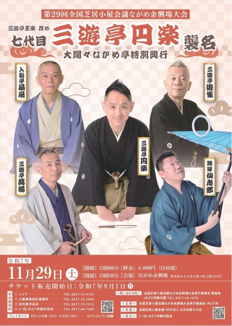 この全国芝居小屋会議ながめ余興場大会開催にあわせて、令和7年11月29日には、これまで、数多くの落語会の会場として親しまれ、多くの人々の笑いに包まれてきた「ながめ余興場」において「三遊亭王楽改め 七代目円楽襲名 大間々ながめ亭特別興行」を開催します。
