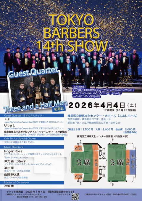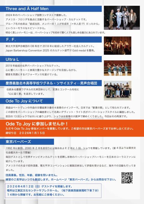 ゲストに2024年のバーバーショップ国際コンテストで優勝したThree and A Half Men、第2回日本バーバーショップコンベンションで優勝したF.F.などを迎えて開催します。