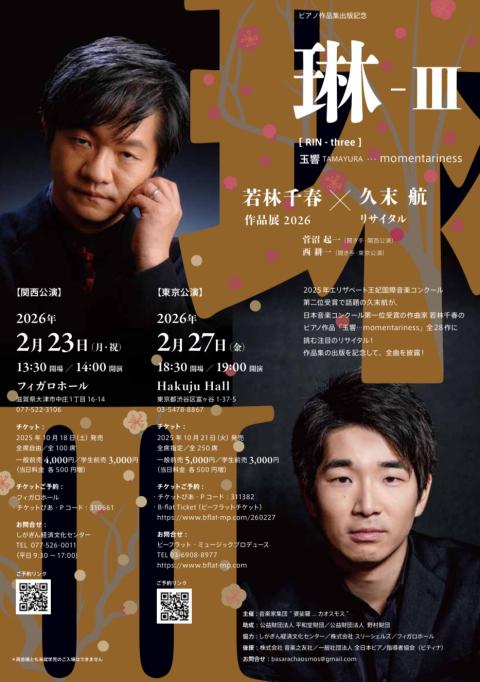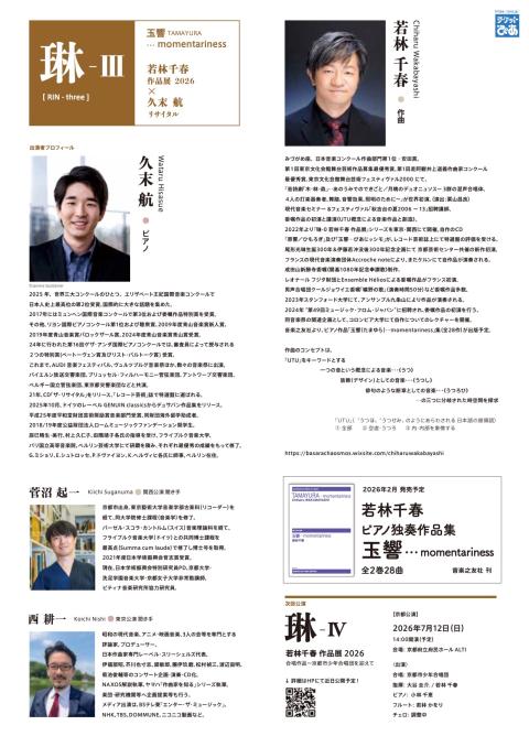 2025年エリザベート王妃国際音楽コンクールのピアノ部門で、日本人最高位となる第2位に輝き、大きな話題を集めるピアニストの久末航による演奏で、若林のピアノ独奏連作シリーズ「玉響(たまゆら)... momentariness」全28作を取り上げる。