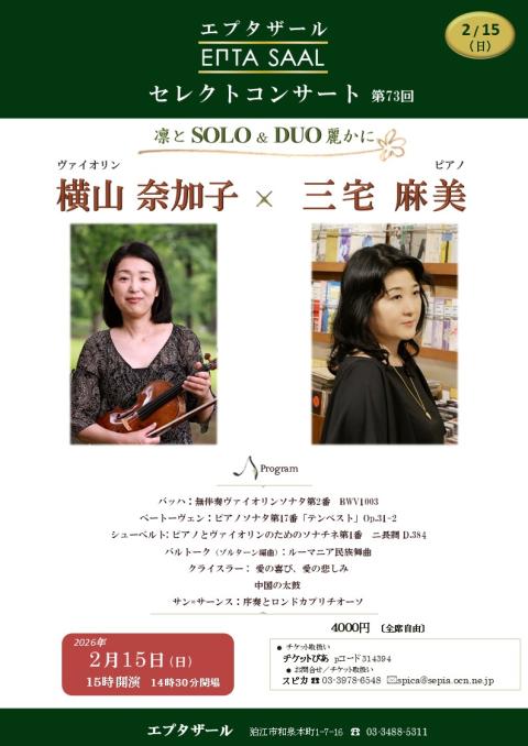 前半は、「バッハの無伴奏ヴァイオリンソナタ・パルティータ全曲」のCDが好評を博している横山奈加子がバッハの無伴奏ソナタ第2番を、ベートーヴェンのピアノソナタ全32曲演奏会が高く評価された三宅麻実がベートーヴェンのソナタ「テンペスト」を、それぞれに凛と奏でます。