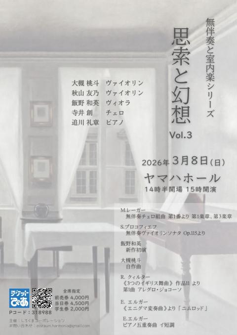 2026年3月8日、銀座ヤマハホールにて無伴奏と室内楽シリーズ「思索と幻想Vol.3」を開催いたします。