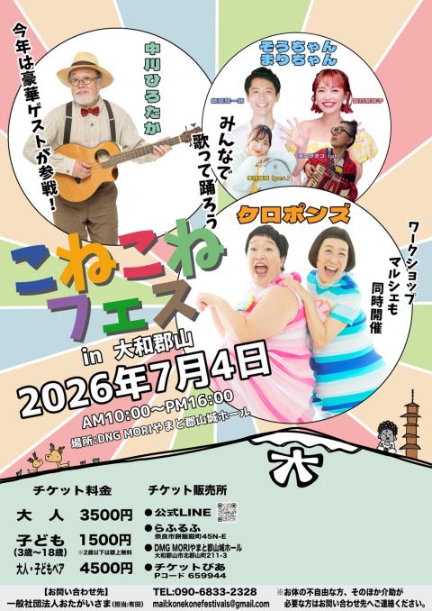 障がいがあってもなくても楽しめるイベントの開催を目指し、2026年7月4日(土)にDMG MORI やまと郡山城ホール大ホール(コンサートのみ有料)とレセプションホール(無料)にてファミリーコンサート&ワークショップイベント「こねこねフェス」を開催いたします。