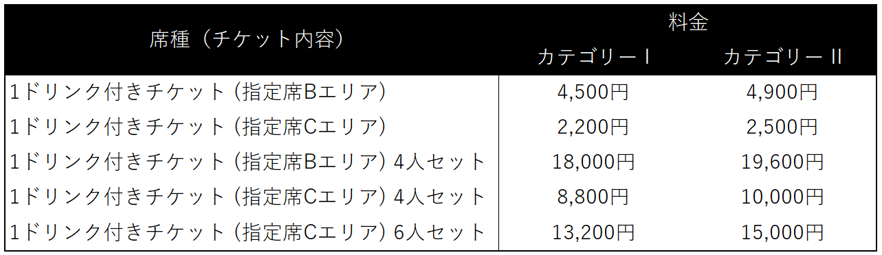 1ドリンク付チケットをご購入の際は、必ず「1ドリンク付」が頭に入った席種をご選択ください。