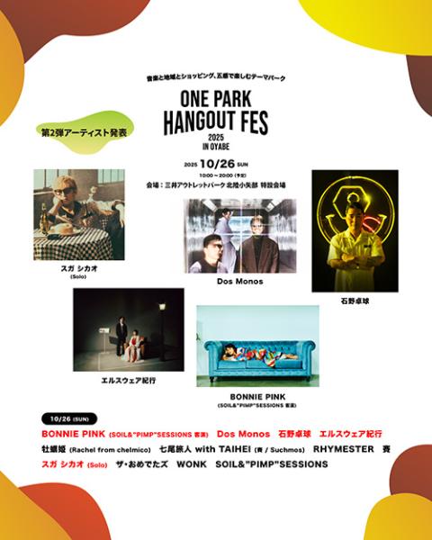 開催時間:10:30~19:00(予定)。雨天決行・荒天中止。保護者1名につき、小学生以下のお子様1名まで入場無料です。2名からは、お子様追加チケット(当日販売)2,200円をお支払い頂きます。中高生割は、当日エントランスにて学生証をご提示ください。ご提示いただけない場合は当日券販売所にて差額(4,400円)をお支払い頂きます。出演者変更、公演途中やむを得ない事由により中止の場合の返金はできません。その他、詳細は公式HPをご覧ください。お問合せ:ONE PARK HANGOUTFES in OYABE 実行委員会事務局 info@oneparkhangoutfes.jp