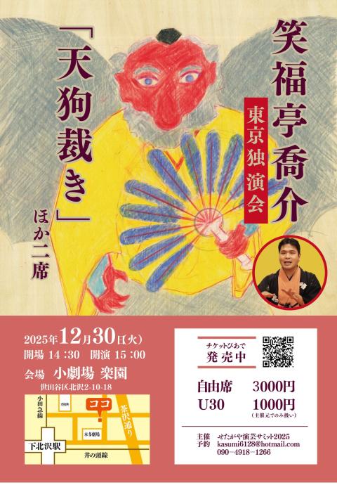 12/30昼の部「笑福亭喬介東京独演会」・夜の部「師走の萬橘」の昼夜通し券(4,800円)は主催のせたがや演芸サミットのみの扱いとなります。