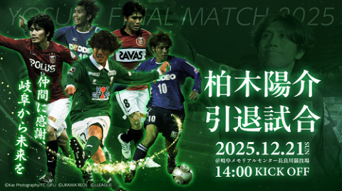 サンフレッチェ広島、浦和レッズ、FC岐阜で活躍し、2023シーズン限りで現役を引退した柏木陽介の引退試合が12/21(日)、岐阜メモリアルセンター長良川競技場にて開催!