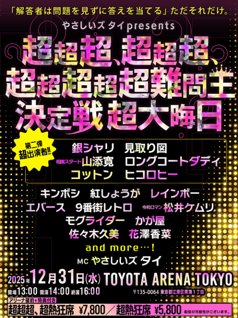 超人気ライブが大晦日にパワーアップして開催。「解答者は問題を見ずに答えを当てる」ただそれだけ!やさしいズ・タイ、キンボシ、紅しょうが、レインボーほか出演。
