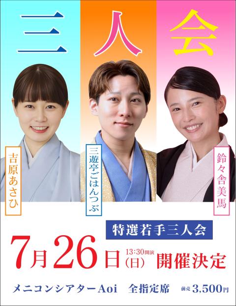 現在二ツ目で最も勢いのある、三遊亭ごはんつぶ・吉原あさひ・鈴々舎美馬による三人会