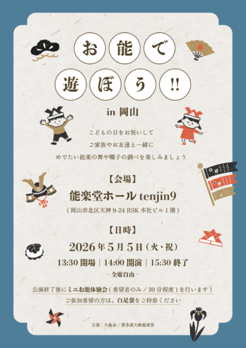 子供の日、端午の節句に和の調べ、能の謡や舞お囃子の音色でゆったりとした時間をお楽しみください。