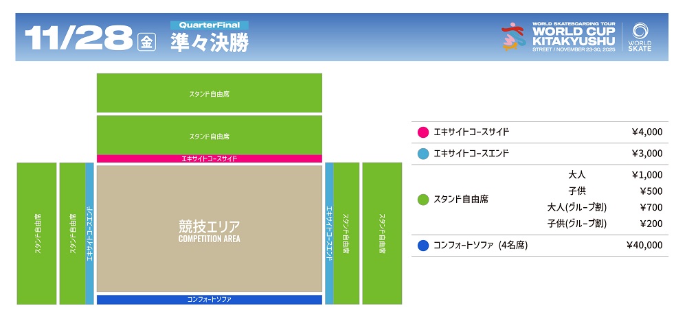 3歳以下膝上観戦無料。お席を必要とする場合は、チケットをご購入ください。子供=高校生以下。エキサイトコースサイド、エンドは指定席となります。自由席A、Bはそれぞれ指定されたエリア内からの観戦となります。
