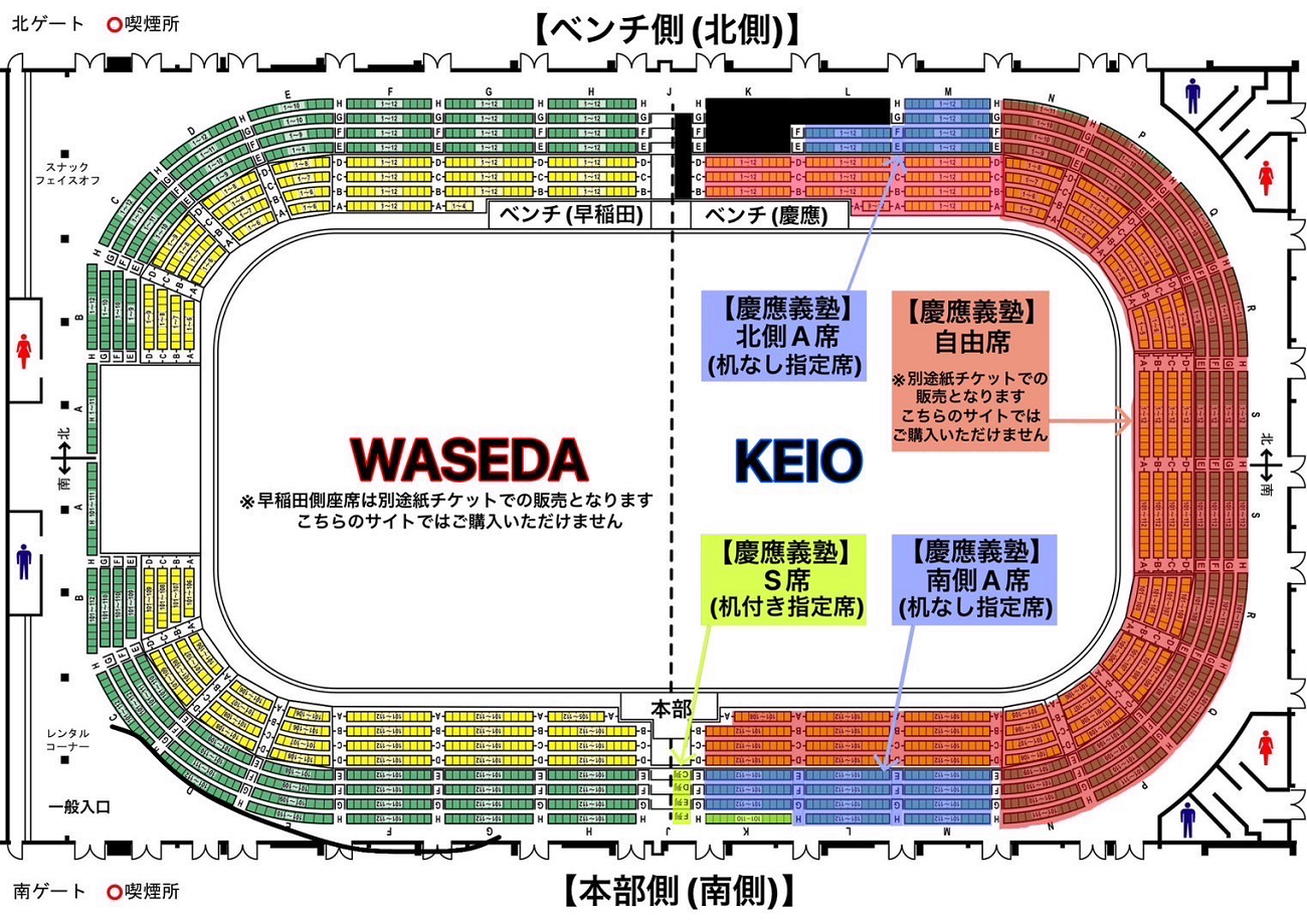 試合開始時間は当日の進行状況により前後する場合がございますので、予めご了承ください。会場南側では応援指導部による演奏が実施されますので、大きい音が苦手な方には北側座席のご購入を推奨しております。自由席チケットは会場での当日販売を実施いたします。チケットをお持ちでない方はご入場いただけません。
