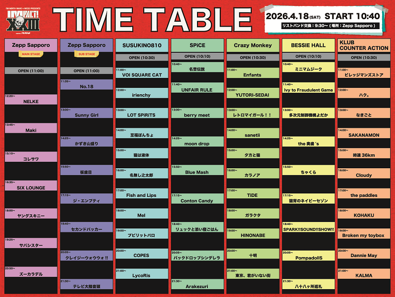 4/18(土)に札幌市内の6会場で開催するサーキットイベント!ズーカラデル、サバシスター、ヤングスキニー、SIX LOUNGE、コレサワら出演。
