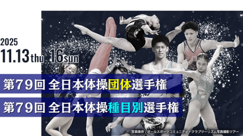 第79回全日本体操団体選手権・種目別選手権を11/13(木)~16(日)、高崎アリーナにて開催!13(木)は男女種目別予選、14(金)は男女団体I班、15(土)は男女団体II班、16(日)は男女種目別決勝を実施。