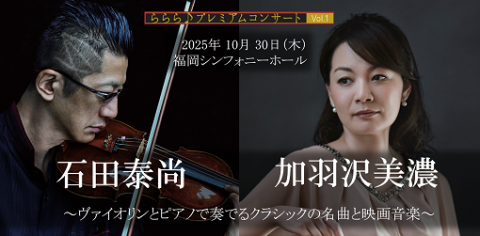 石田泰尚×加羽沢美濃が奏でるクラシックの名曲と美しい映画音楽に浸る、プレミアムなひとときをお楽しみください。10/30(木)アクロス福岡 福岡シンフォニーホールにて開催。