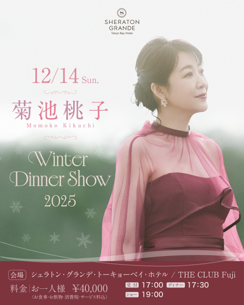 可憐な笑顔と柔らかな歌声で時代を超えて愛され続ける菊池桃子が、12/14(日)シェラトン・グランデ・トーキョーベイ・ホテルにて、初めてのクリスマスディナーショーを開催!ホテルシェフが腕をふるうディナーとともに、しとやかな雰囲気に浸る贅沢な時間をお楽しみに。