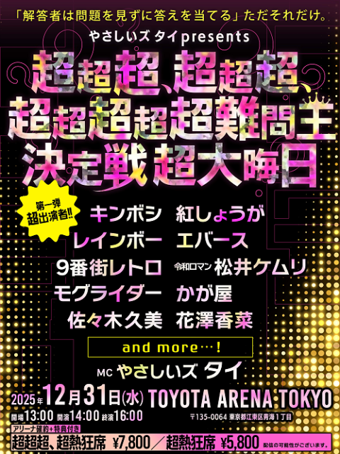 超人気ライブが大晦日にパワーアップして開催。「解答者は問題を見ずに答えを当てる」ただそれだけ!やさしいズ・タイ、キンボシ、紅しょうが、レインボーほか出演。