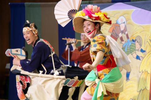 お米作りにまつわる芸能です。日本の太鼓や踊り・唄や和楽器で、お米だけでなく子どもたちの夢や願いが実りますようにと、明日の力となるような作品です。